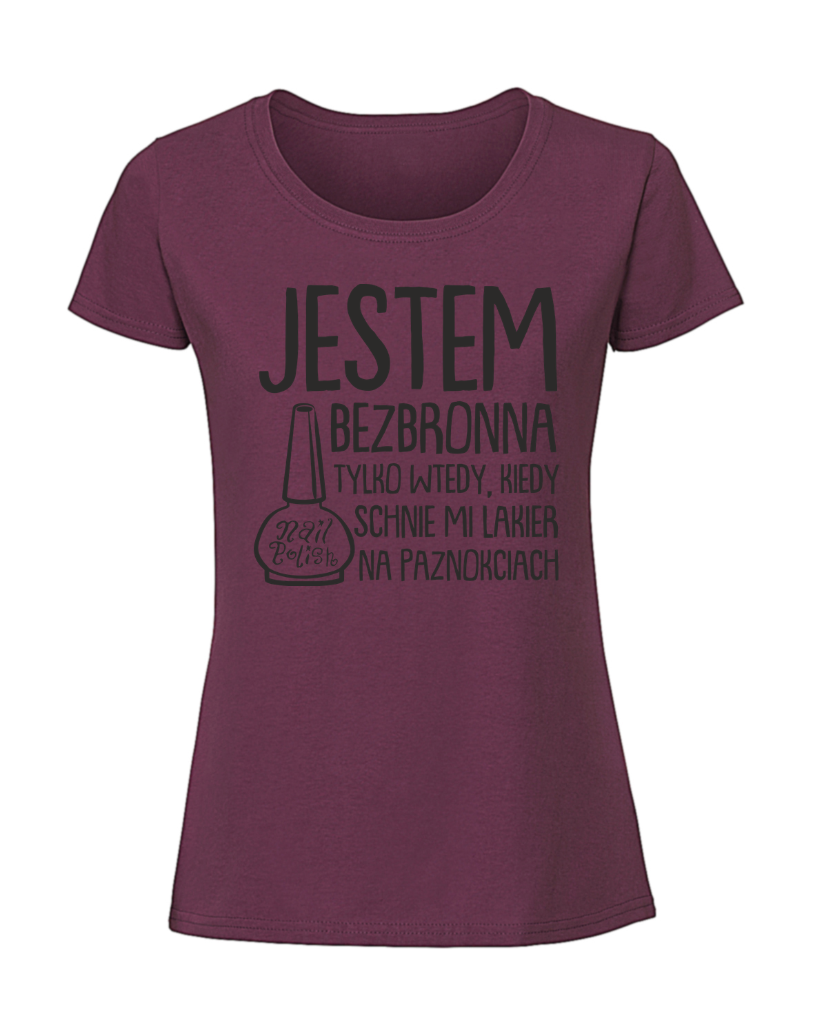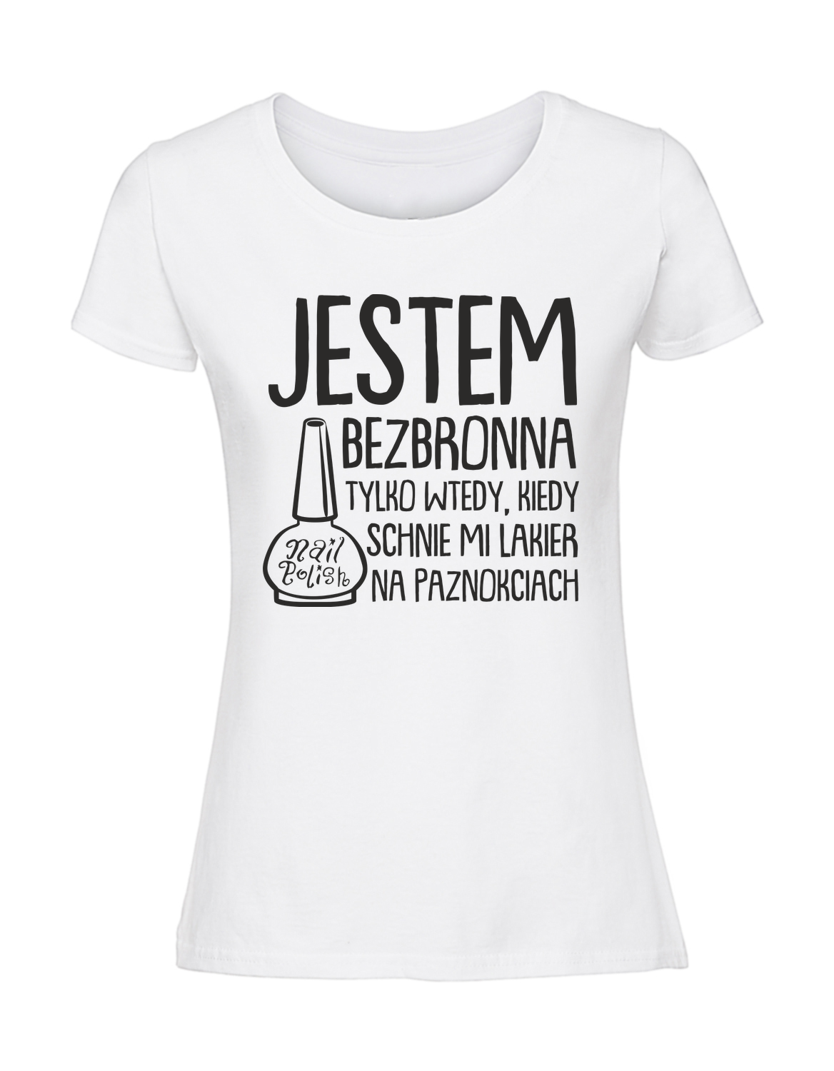 Damska koszulka z nadrukiem – JESTEM BEZBRONNA TYLKO WTEDY KIEDY SCHNIE MI LAKIER N APAZNOKCIACH