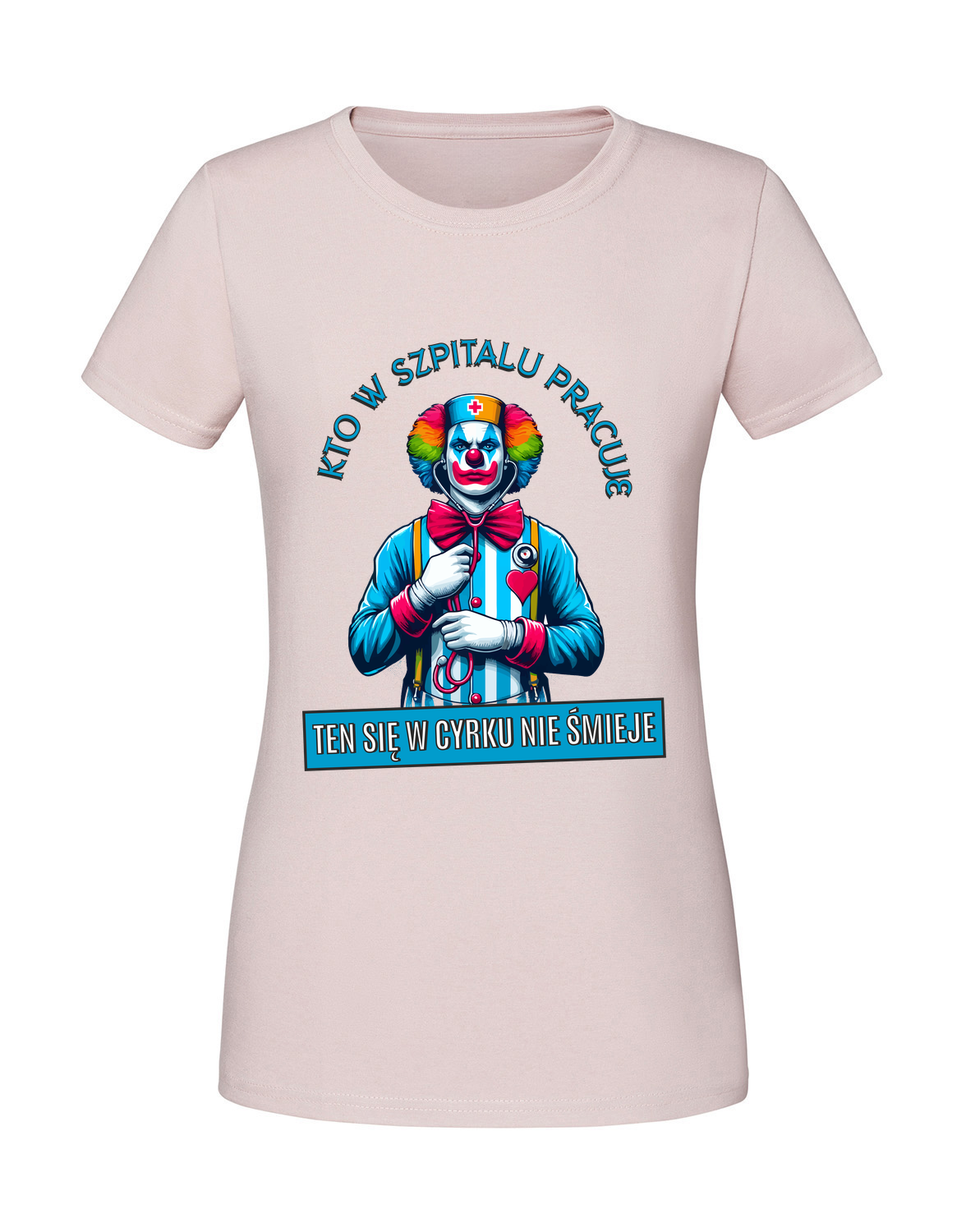 Damska koszulka z nadrukiem – KTO W SZPITALU PRACUJE TEN SIĘ W CYRKU NIE ŚMIEJE