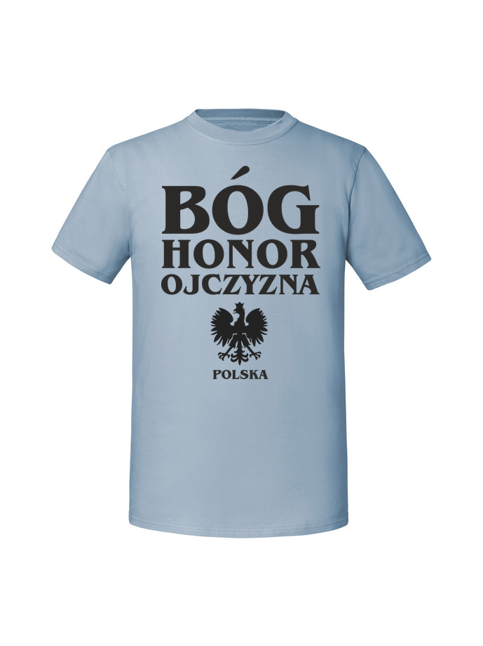 Koszulka męska z nadrukiem 'BÓG HONOR OJCZYZNA POLSKA’ wykonana w 100% z czesanej bawełny ringspun (195 g/m²). Miękka w dotyku, przewiewna i niezwykle przyjemna w noszeniu. Certyfikaty OEKO TEX i AMFORI.