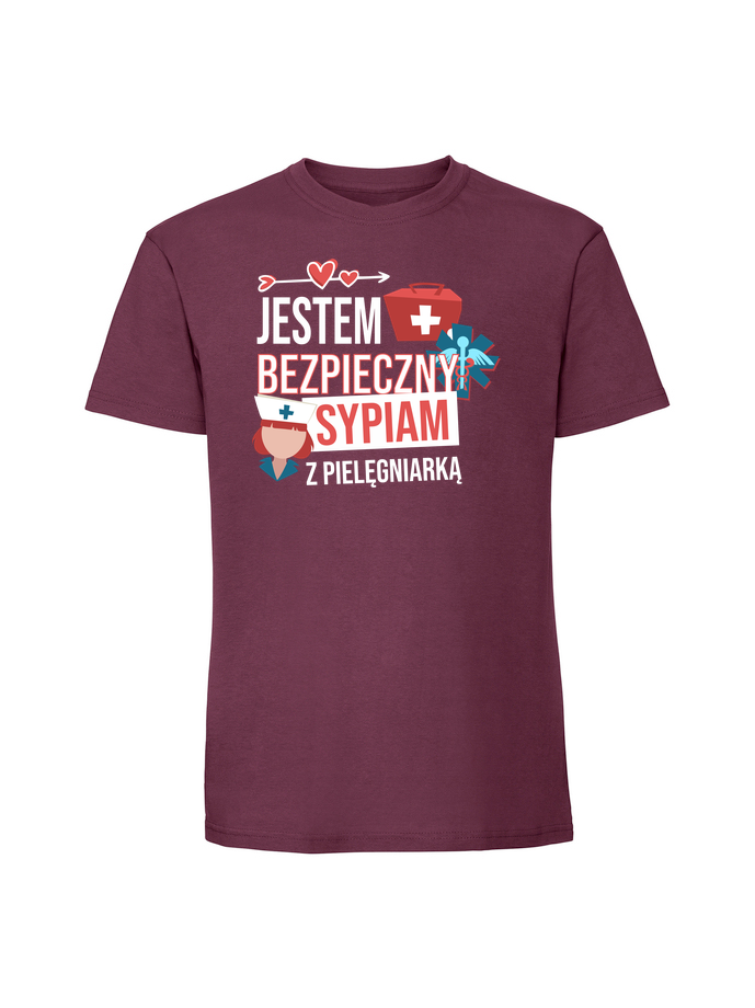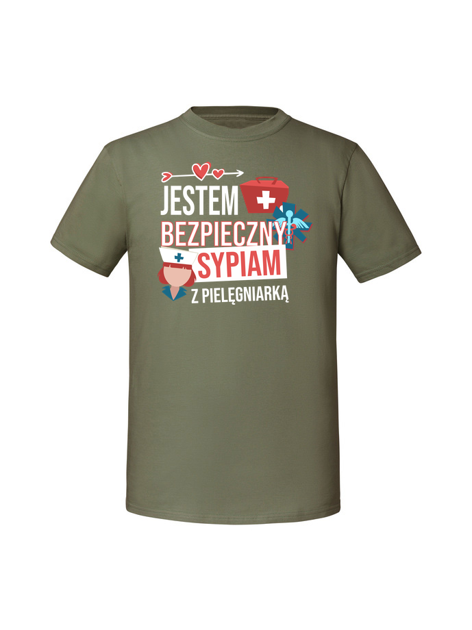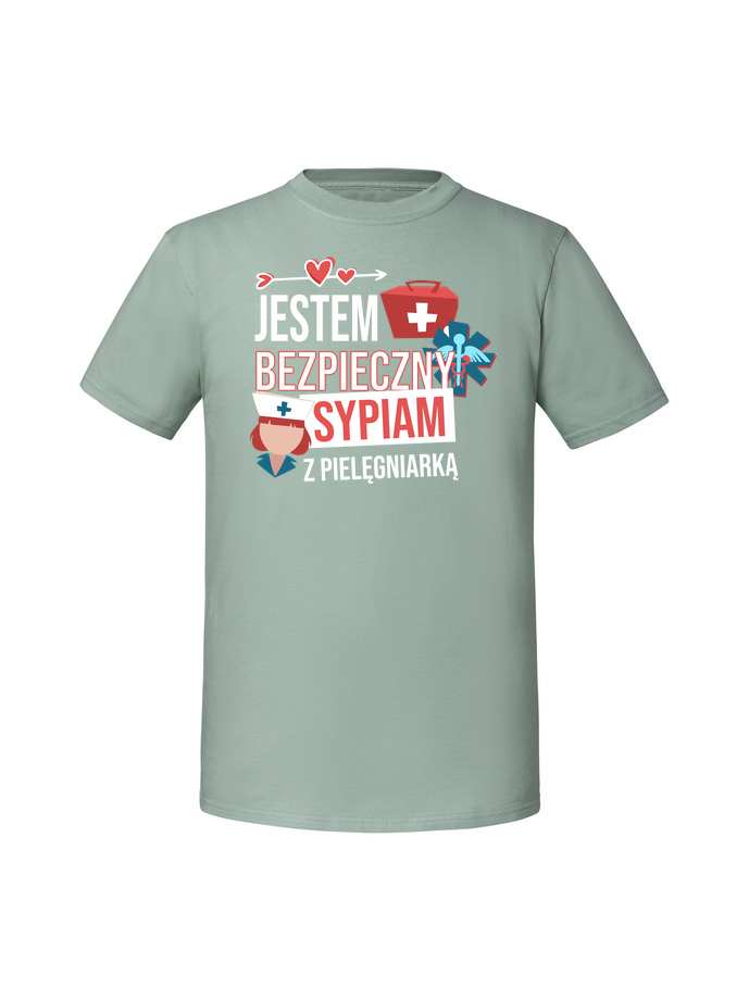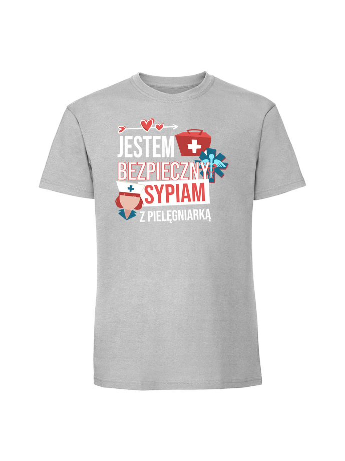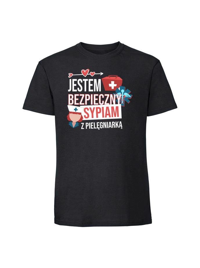 Męska koszulka z nadrukiem – JESTEM BEZPIECZNY SYPIAM Z PIELĘGNIARKĄ v1