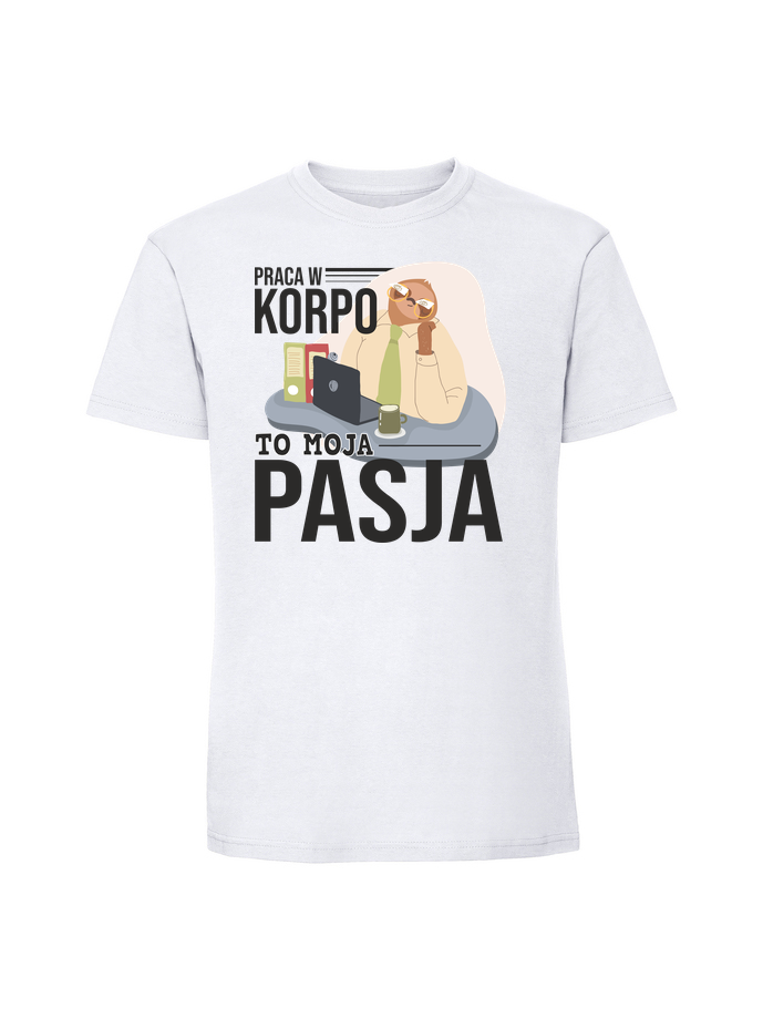Męska koszulka z nadrukiem – praca w korpo to moja pasja leniwiec