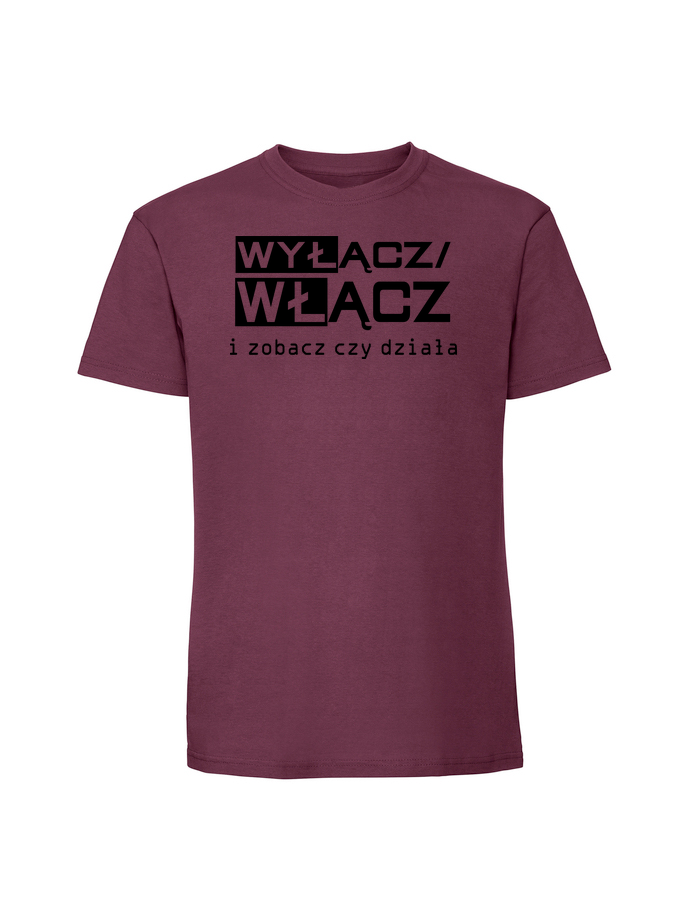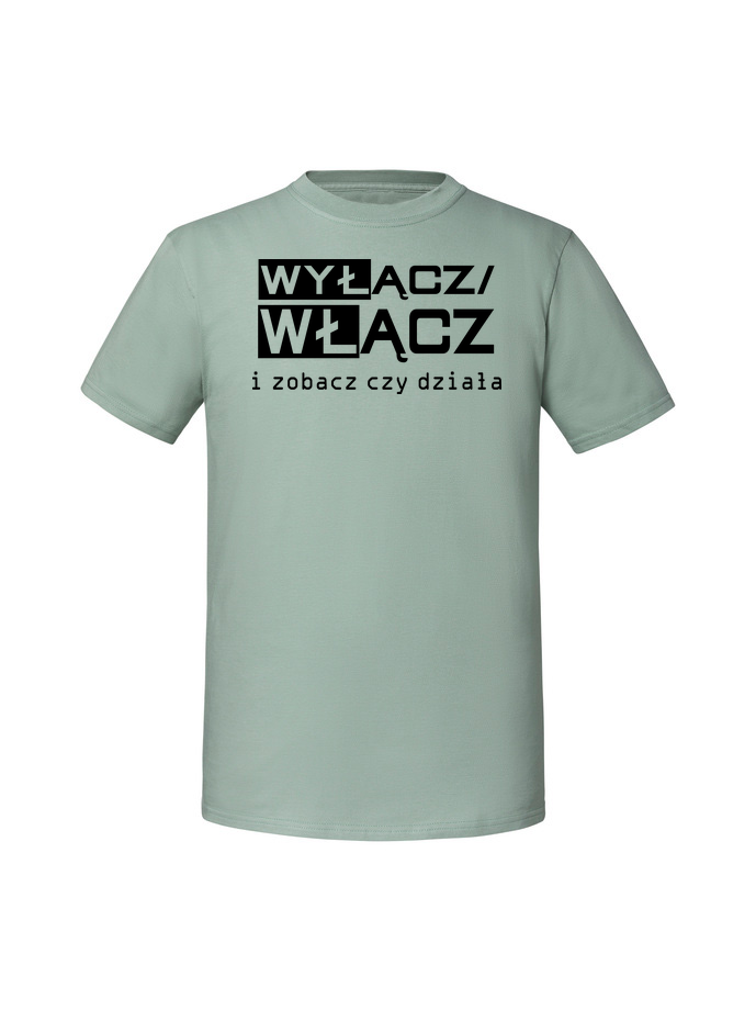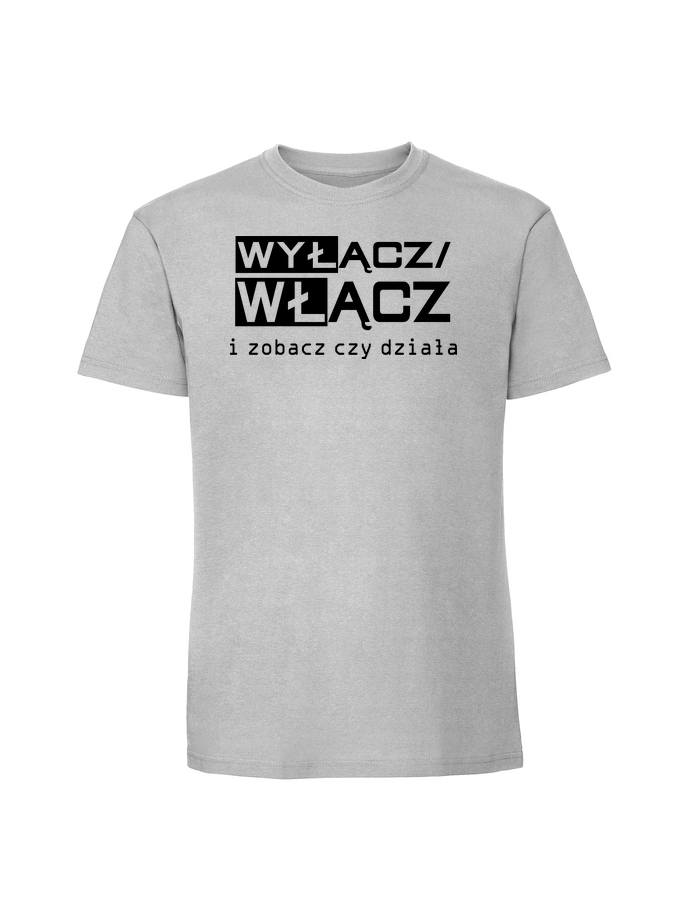 Koszulka męska z nadrukiem 'Wyłącz włącz i zobacz czy działa’ wykonana w 100% z czesanej bawełny ringspun (195 g/m²). Miękka w dotyku, przewiewna i niezwykle przyjemna w noszeniu. Certyfikaty OEKO TEX i AMFORI.