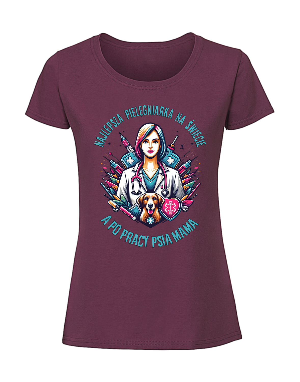 Damska koszulka z nadrukiem – najlepsza pielęgniarka na świecie a po pracy psia mama